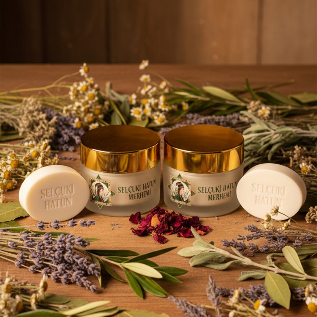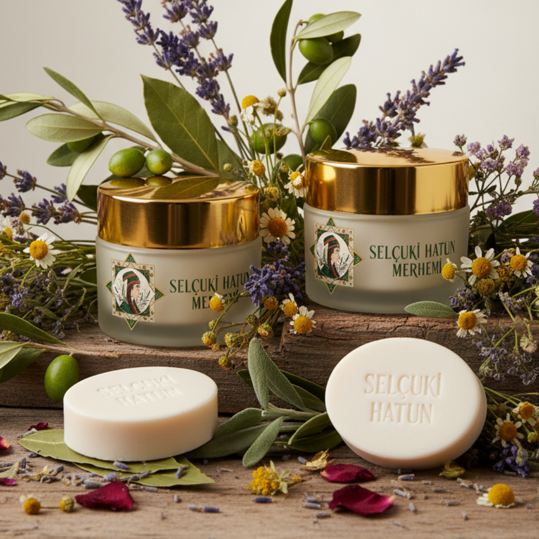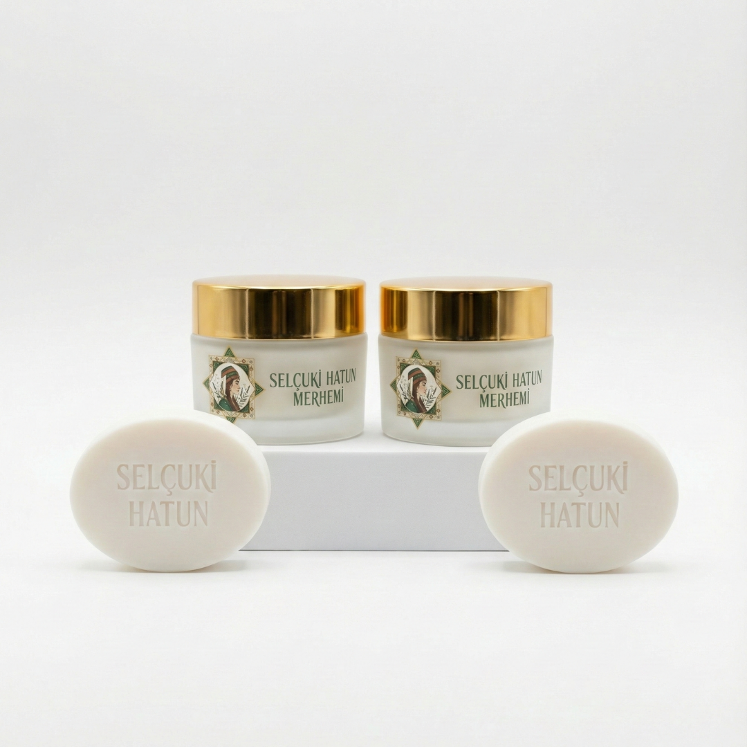 Arınma adımından sonra, 2 adet Selçuki Hatun Merhemi (50 ml) ile bakımınızı tamamlayın. Zeytinyağı, Yabani Kekik Yağı, Pantenol ve Vitamin E içeren zengin formülü, cildinizi derinlemesine besler ve yatıştırır. Durulama gerektirmeyen bu merhem, cildinize sağlıklı bir parlaklık ve ipeksi bir yumuşaklık kazandırır.